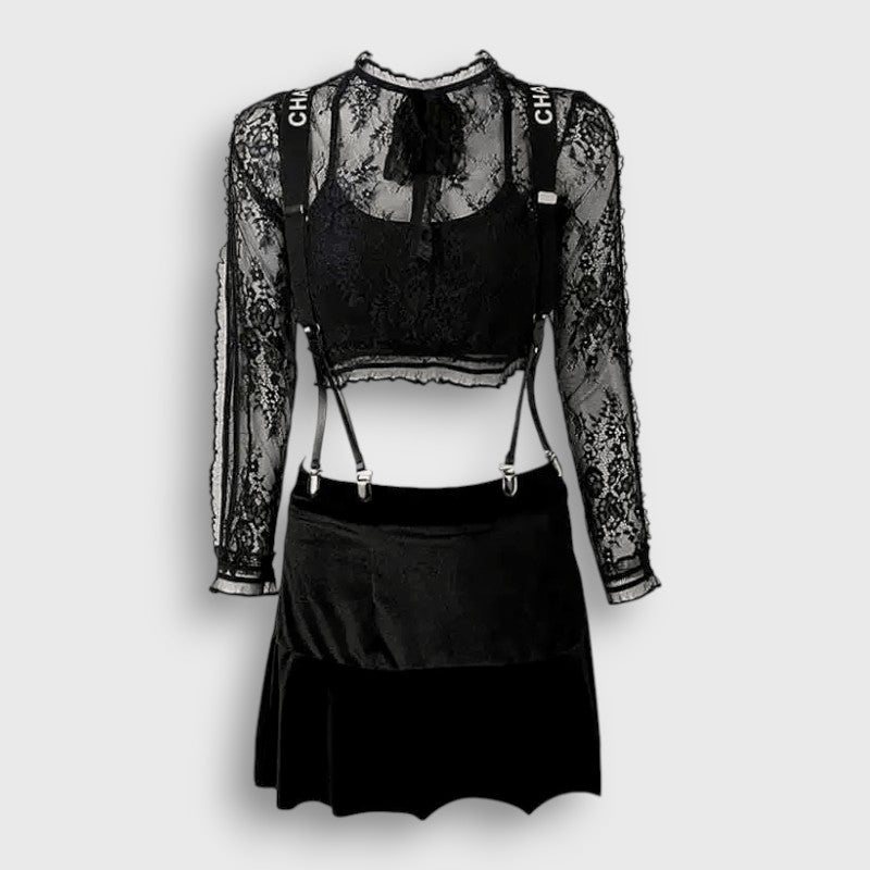 Inspiré du style élégant et audacieux de Jennie, cet ensemble kpop noir combine un crop top en dentelle à manches longues et une mini jupe taille haute pour un look K-pop irrésistiblement tendance. La dentelle apporte une touche délicate et raffinée, tandis que la coupe ajustée met subtilement en valeur la silhouette.